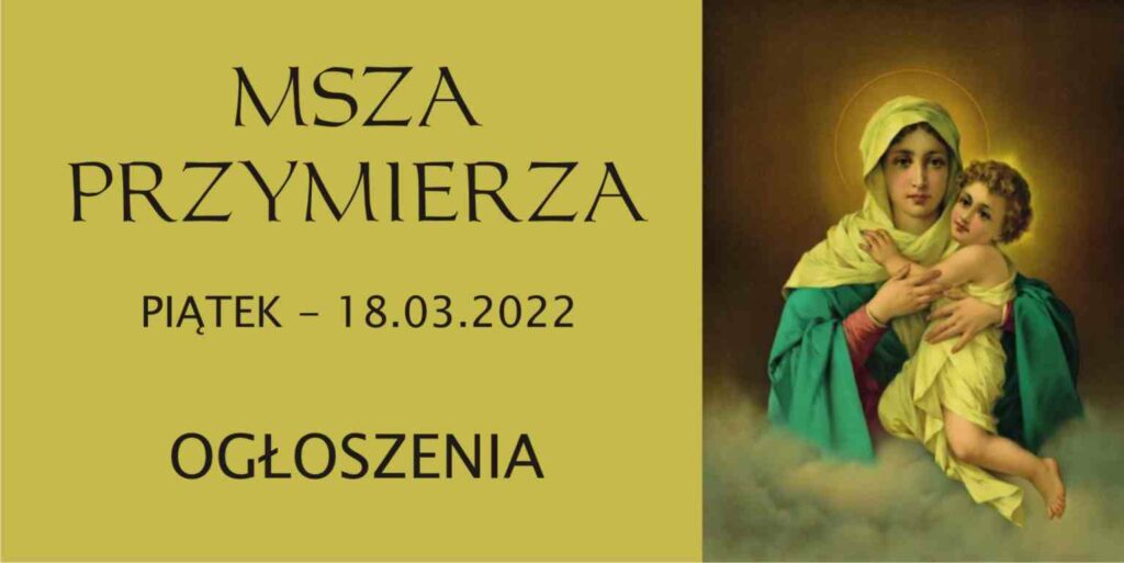 Ogłoszenia 18 marca 2022r. 1. Dziękujemy rodzinom ligowym za przygotowanie oprawy liturgicznej dzisiejszej Mszy Przymierza. 2. Wyjazd do Częstochowy – 26 marca w sobotę. Powrót rano w niedzielę 27 marca.…